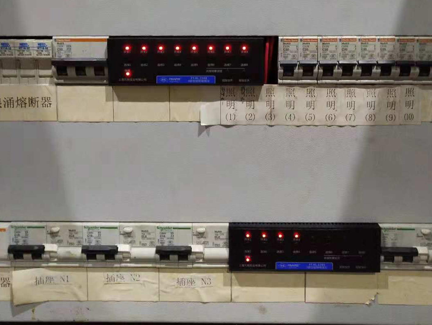 該項(xiàng)目采用的是經(jīng)濟(jì)型的照明控制模塊,如下圖,4回路的,8回路的都有。且由于經(jīng)濟(jì)型模塊不具備遠(yuǎn)程控制功能,所以該項(xiàng)目則是每個(gè)電箱配了一個(gè)3.5寸觸摸屏。