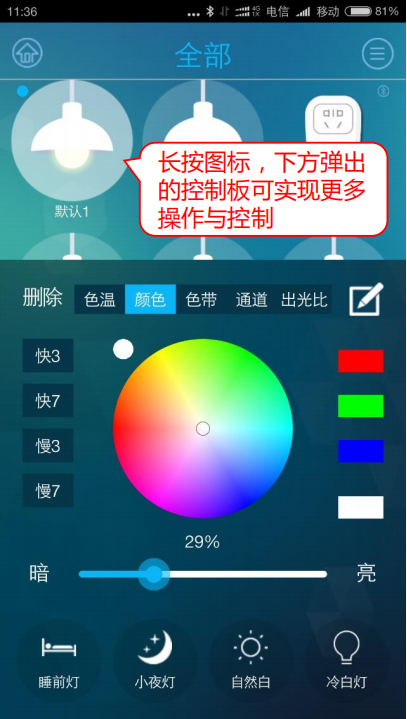 藍牙(Bluelooth)無線自組網(wǎng)技術實現(xiàn)互聯(lián),設備與設備之間級聯(lián),實現(xiàn)不受限的網(wǎng)絡覆蓋范圍。這是一種基于藍牙的無線智能照明控制系統(tǒng),其包括智能照明設備、無線控制設備及可控制、配置該照明控制系統(tǒng)的移動端APP軟件。