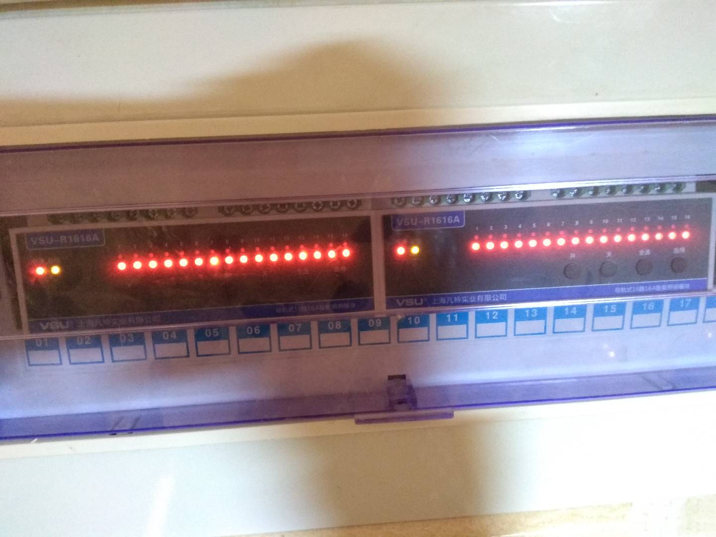 VSU智能照明控制系統(tǒng)實(shí)現(xiàn)對(duì)燈具的集中控制管理,依靠手機(jī)或者電腦平板就可以一鍵開(kāi)閉所有燈具。項(xiàng)目采用的VSU照明設(shè)備有:16路16安智能照明模塊、網(wǎng)關(guān)主機(jī)、電源模塊、級(jí)聯(lián)模塊、連接片。