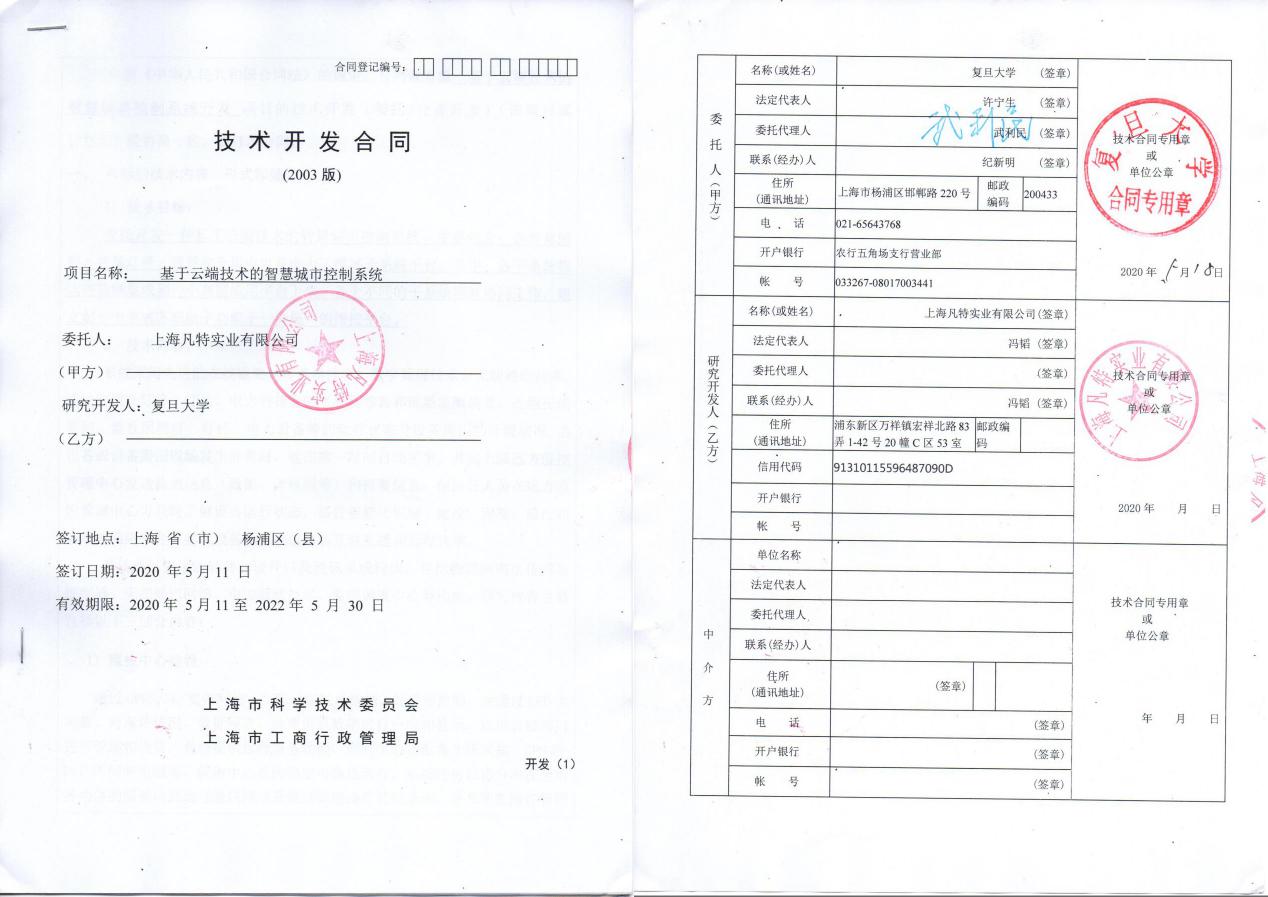 同年 5月11日,上海凡特實業(yè)有限公司正式與復旦大學簽訂《技術開發(fā)合同》——基于云端技術的智慧城市控制系統(tǒng)。項目將圍繞智慧城市開展科學研究、技術開發(fā)、成果轉化及文化交流等方面的合作。這次合作一面是能夠落實國家科教興國戰(zhàn)略,促進科技創(chuàng)新,加快企業(yè)經(jīng)濟發(fā)展,充分利用高等院校的技術、人力等資源以及先進成熟的技術成果。另一面,利用企業(yè)的生產(chǎn)條件,提高教學的科研能力,將科研成果盡快地轉化為生產(chǎn)力,不斷提升企業(yè)的技術和管理水平,雙方發(fā)展各自優(yōu)勢。上海凡特通過多種形式開展全面合作,共同推進公司與復旦學校的全面技術合作,形成專業(yè)、產(chǎn)業(yè)相互促進、共同發(fā)展,努力實現(xiàn)“校企合作、產(chǎn)學雙贏”!
