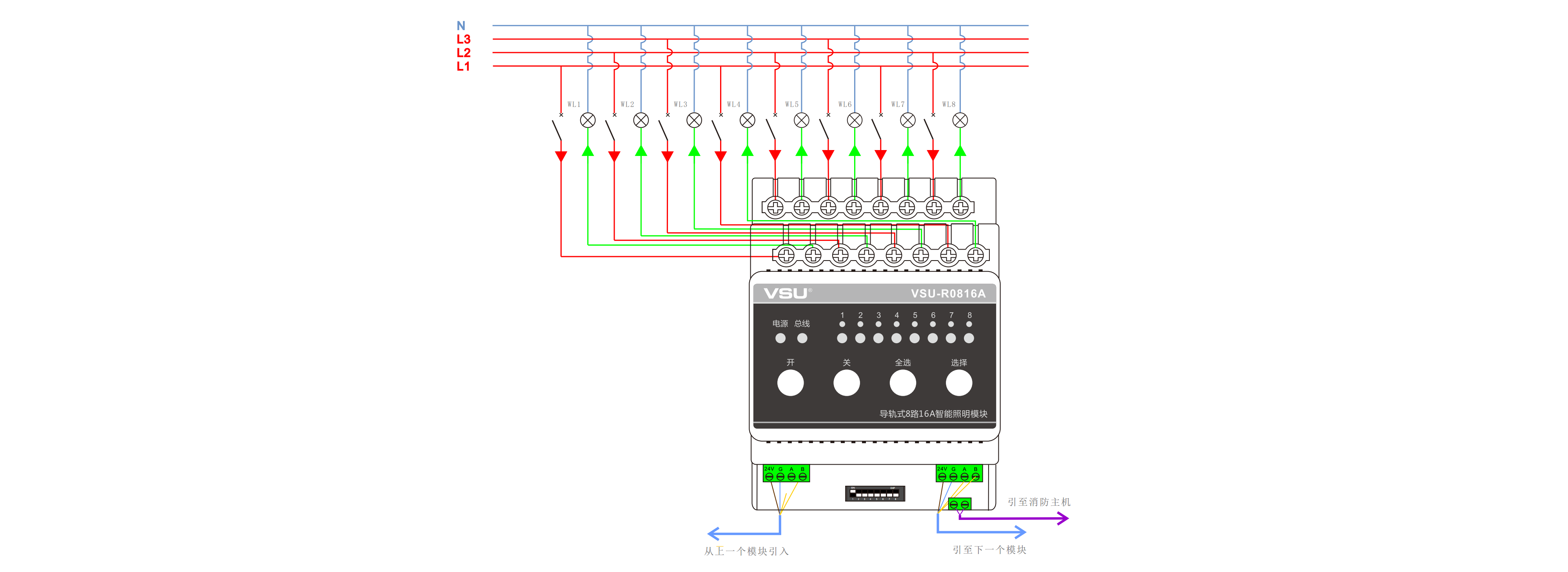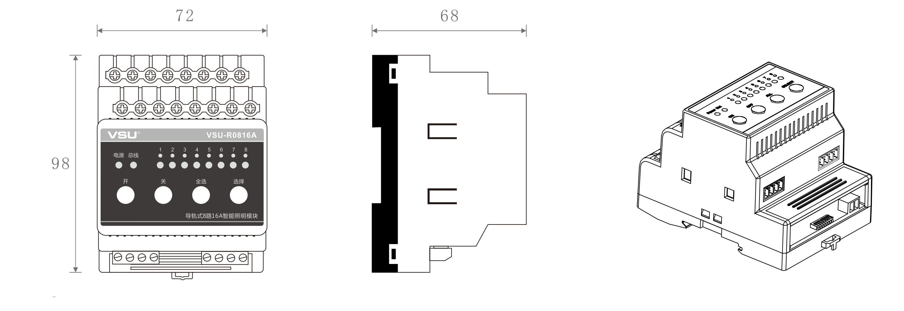 本產(chǎn)品為導(dǎo)軌式安裝,含8路智能繼電器,每回路可獨立控制3520W燈具的開關(guān),帶應(yīng)急按鍵,LED燈時時指示各個回路開關(guān)狀態(tài),可設(shè)置為互鎖控制4組窗簾開合;