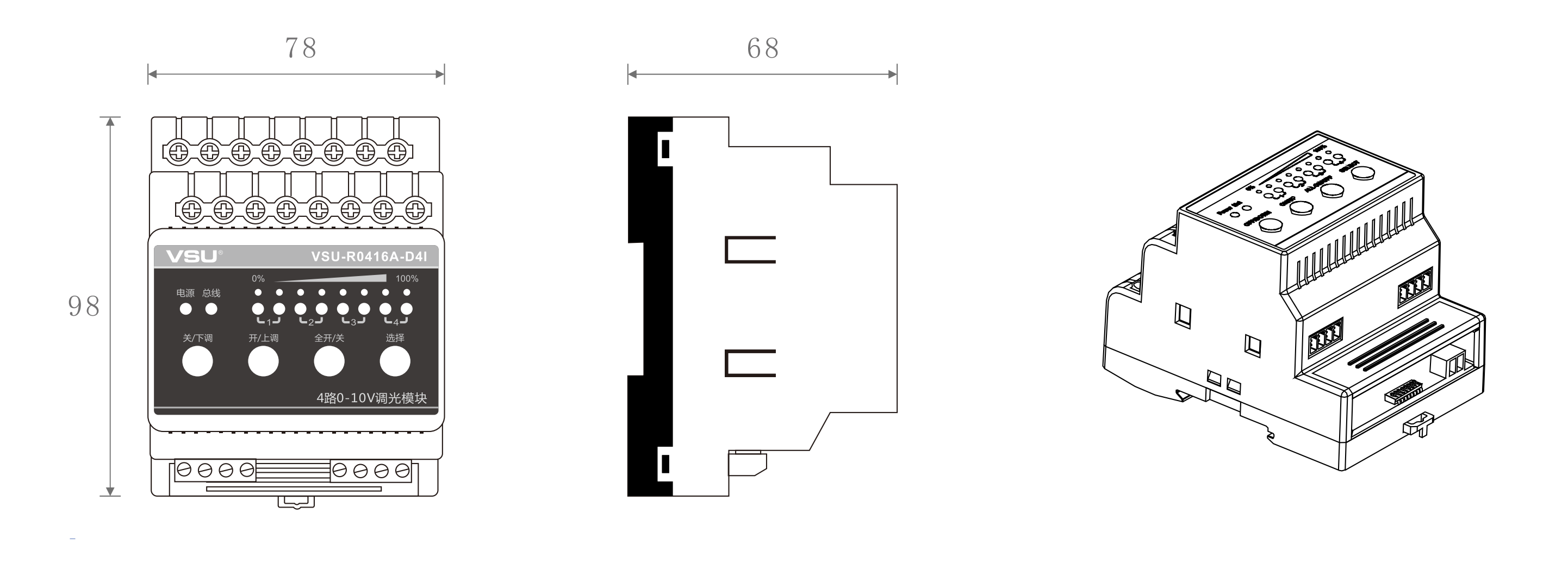 本產(chǎn)品為導軌式安裝,含4路智能繼電器可獨立控制4路3300W燈具的開關,4路0-10V調(diào)光接口配合0-10V調(diào)光變壓器可對日光燈、LED燈等燈具調(diào)光; |