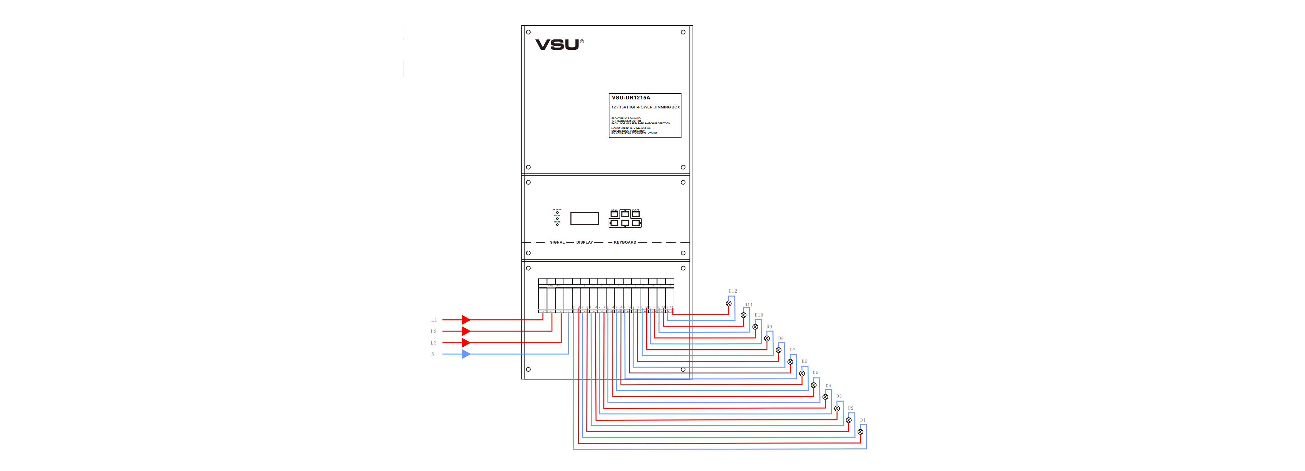 本產(chǎn)品為掛壁式安裝,前沿可控硅調(diào)光;12組調(diào)光通道輸出,每通道3200W;輕巧型設(shè)計美觀大方。帶斷路器保護(hù); |