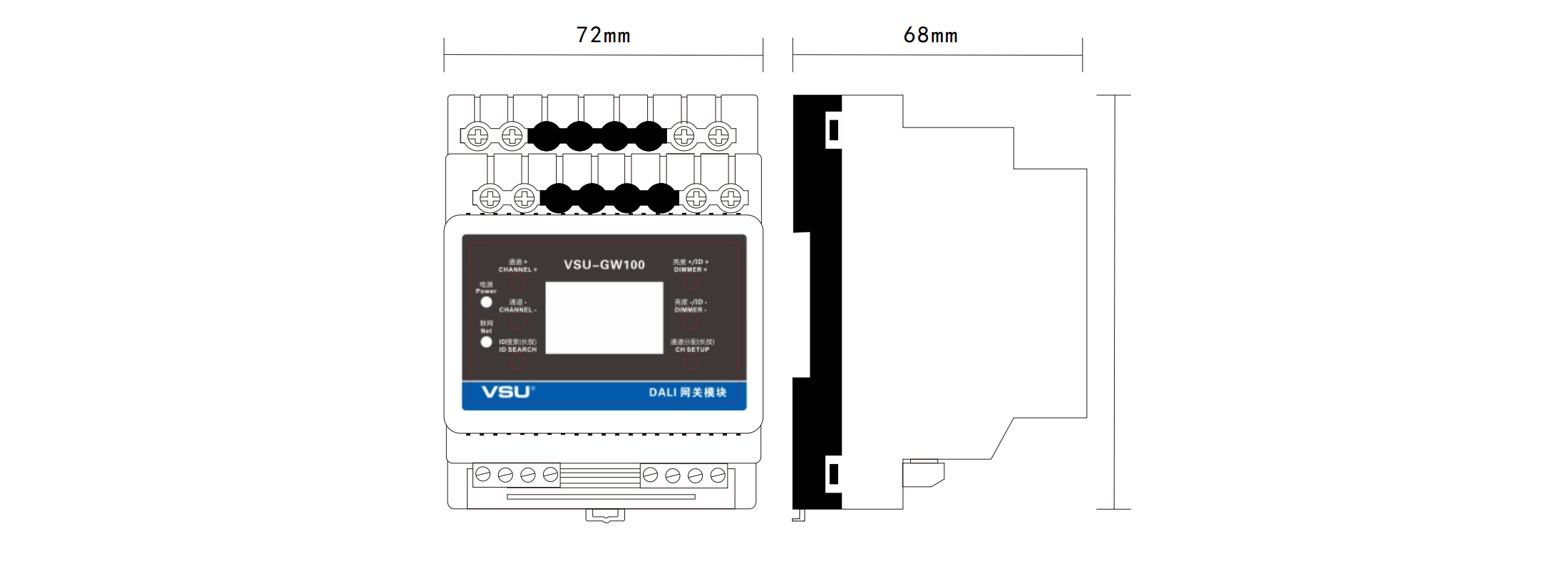 DALI網(wǎng)關(guān)支持VSU-NET協(xié)議與DALI協(xié)議的轉(zhuǎn)換,模塊內(nèi)置DALI電源,具有單條DALI總線(xiàn),最多支持64個(gè)DALI燈光設(shè)備,最多可具有16個(gè)控制通道。模塊采用OLED顯示屏,方便工程配置與調(diào)試 |