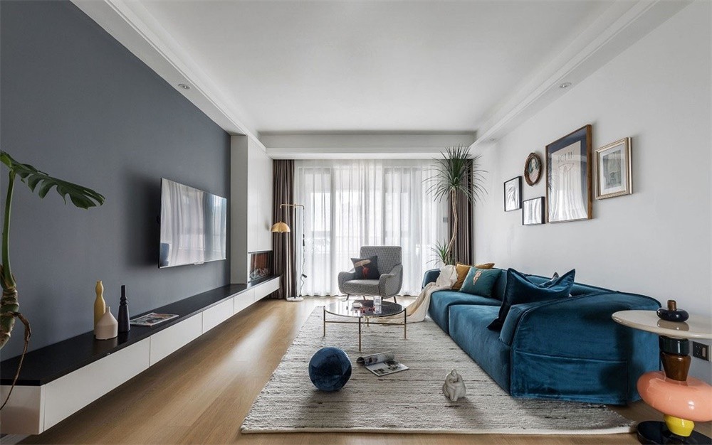 絲絨質(zhì)感的沙發(fā)搭配金屬角的玻璃茶幾,造型別致的糖葫蘆角幾、有趣的抱枕圖案、集實用與美觀于一體的電視柜有了壁爐的襯托讓客廳空間加分,營造出一個愜意輕松的生活氛圍,既混搭又精致。