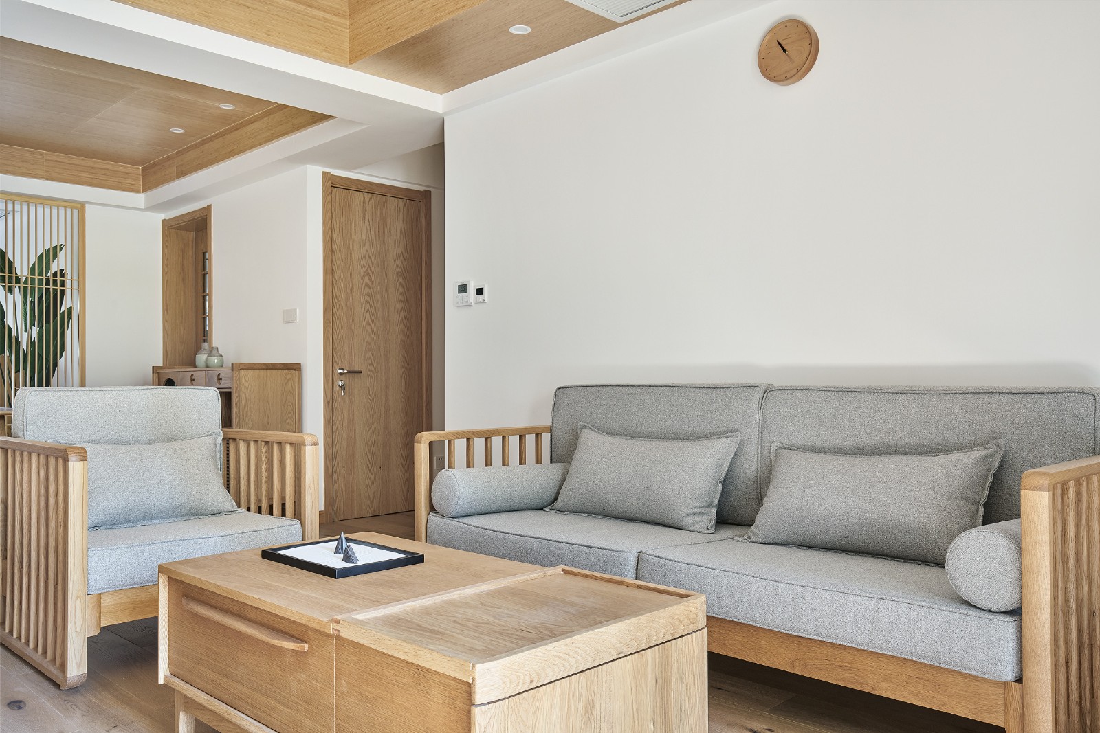 簡單的灰色系布藝沙發(fā),端重卻不失靈動(dòng),自然的背景墻掛上實(shí)木小時(shí)鐘