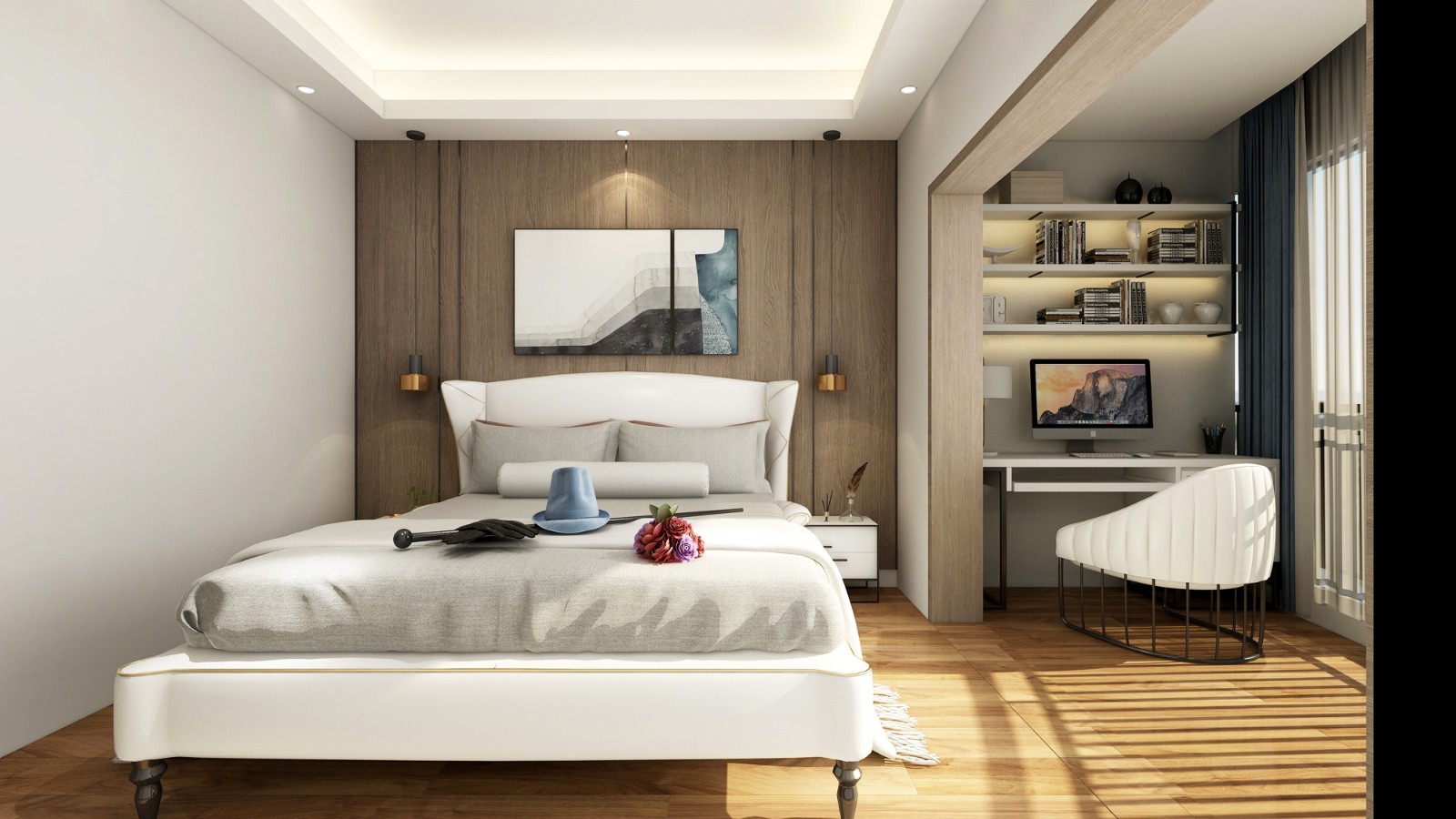 主臥將陽臺(tái)打通,在增大的室內(nèi)空間里打造出一個(gè)專屬的工作區(qū)。