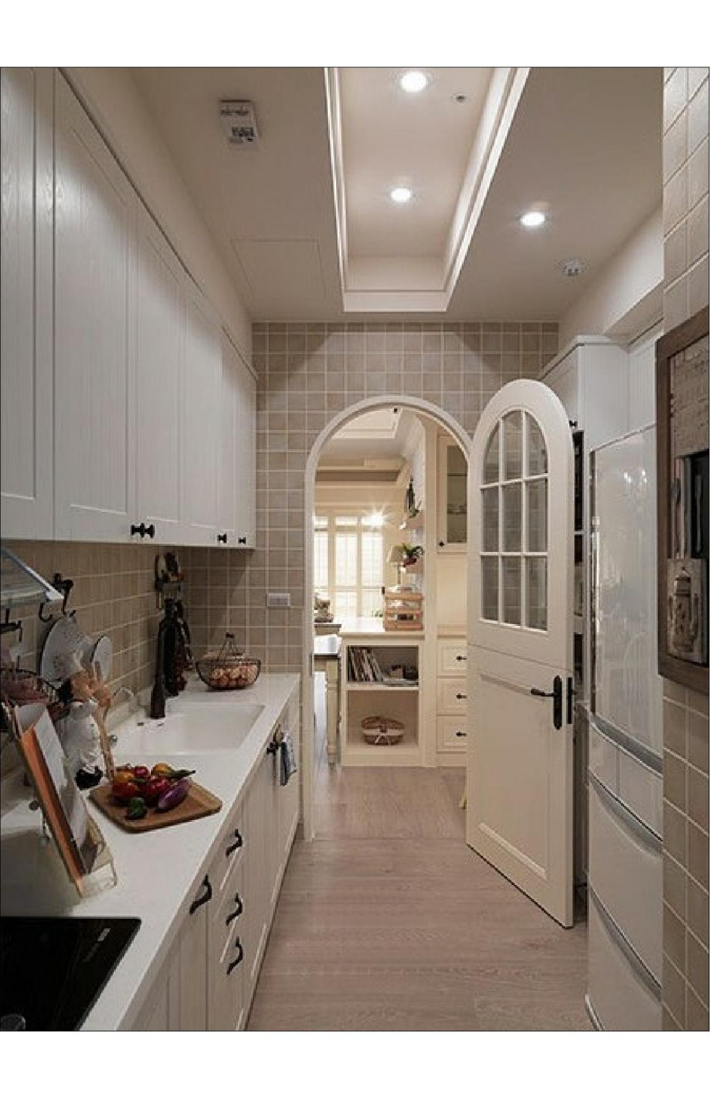 廚房仿木紋地磚的鋪設(shè)使廚房地面與外面的地面結(jié)合為一體。墻磚的選擇也是田園氣息濃重。